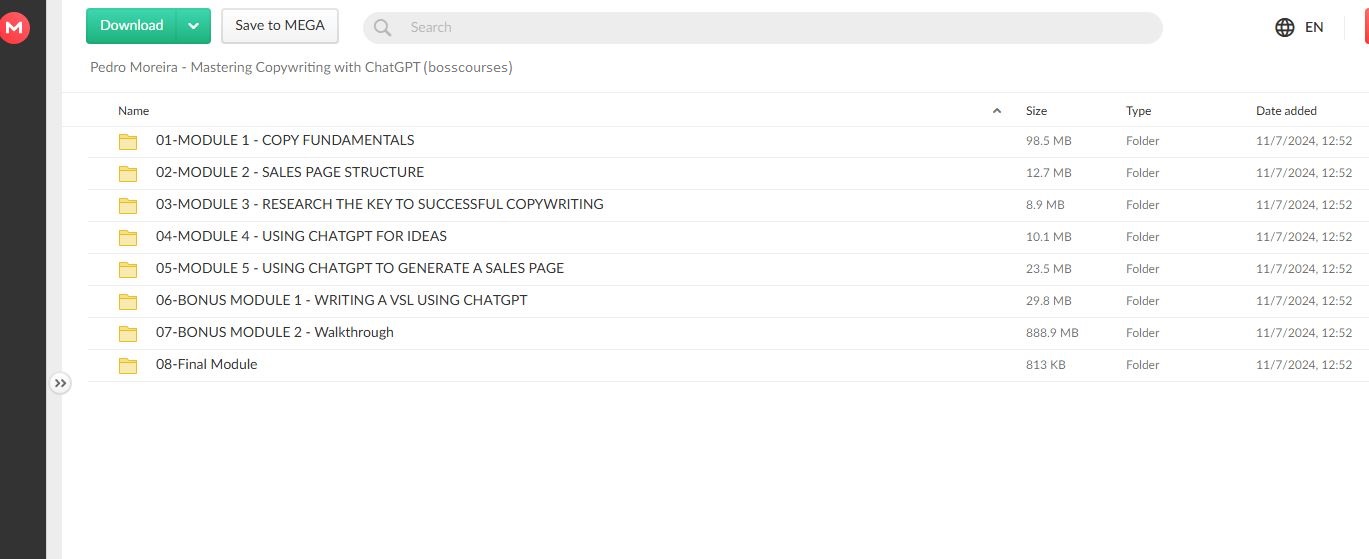 Complete course available on Mega.nz with lifetime access to 19.2 GB of AI copywriting expertise.